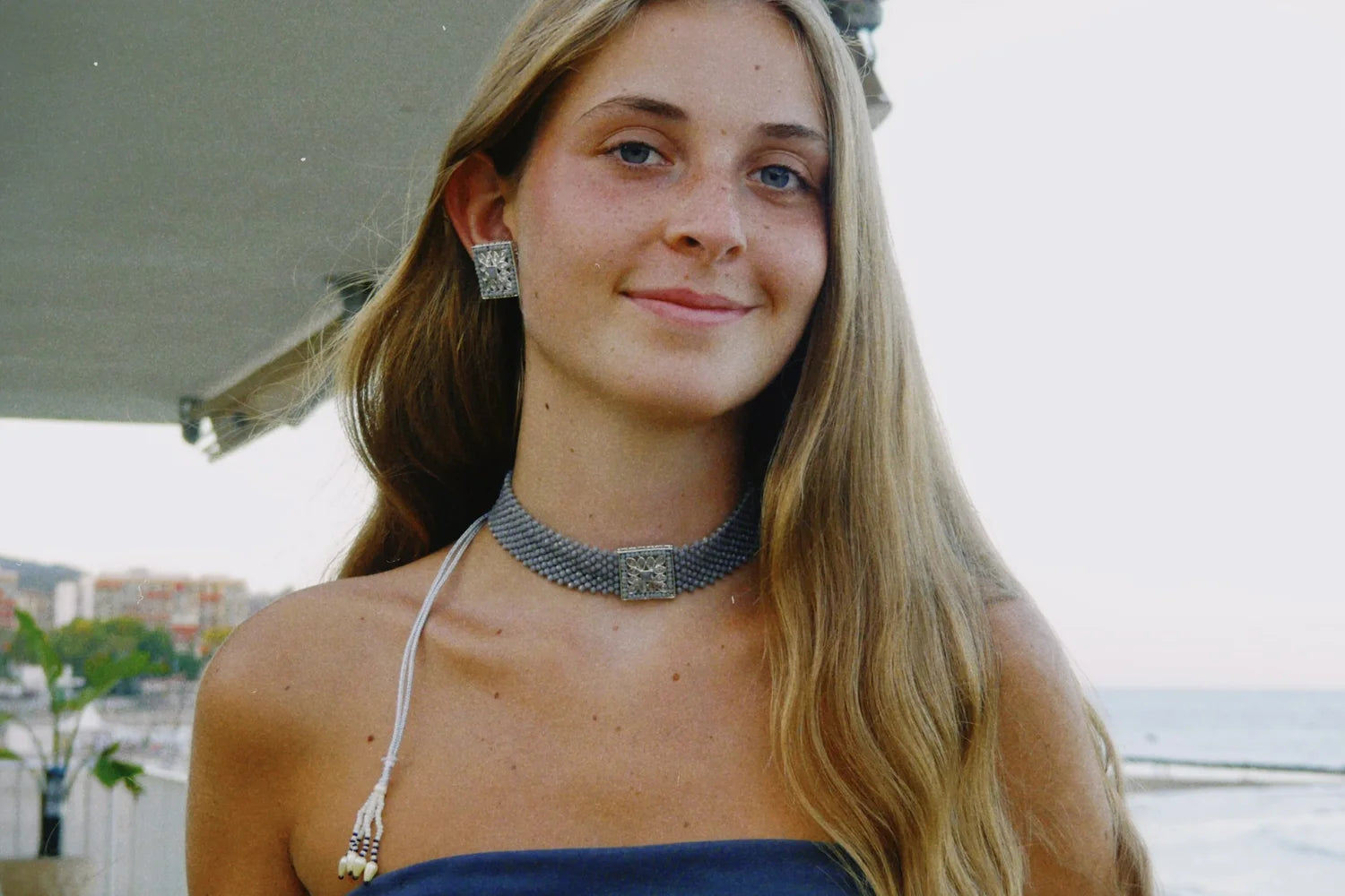 Choker pegado al cuello con malla de bolitas en gris brillante y estructura cuadrada central metálica en grises y plata. Se adapta a cualquier tamaño de cuello gracias al ajuste de cuerda plateada tan típico de la joyería tradicional India. Tiene pendientes a juego.
